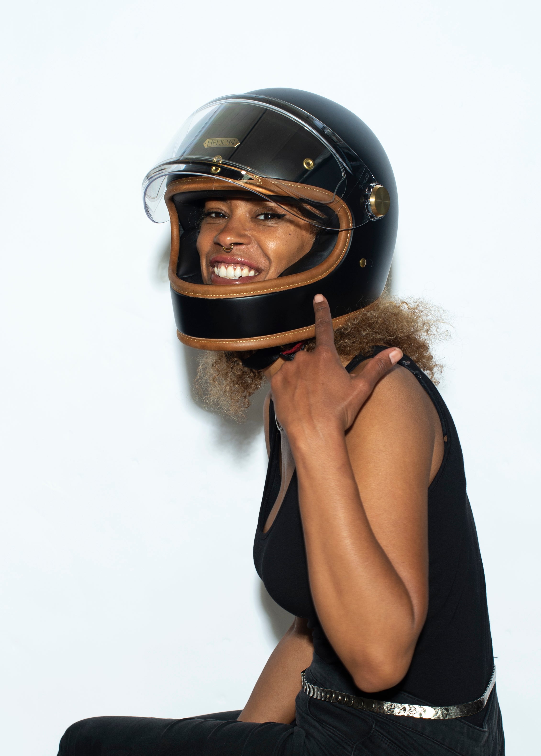 The Heroine Racer 2.0 in Stable Black proves that understatement makes the boldest statement. With a matte black finish, brass hardware, and rich brown leather trim, this helmet balances retro refinement with modern performance.